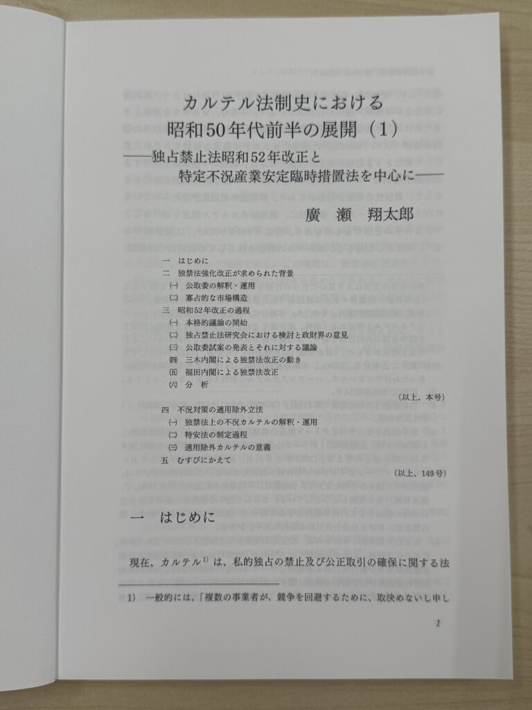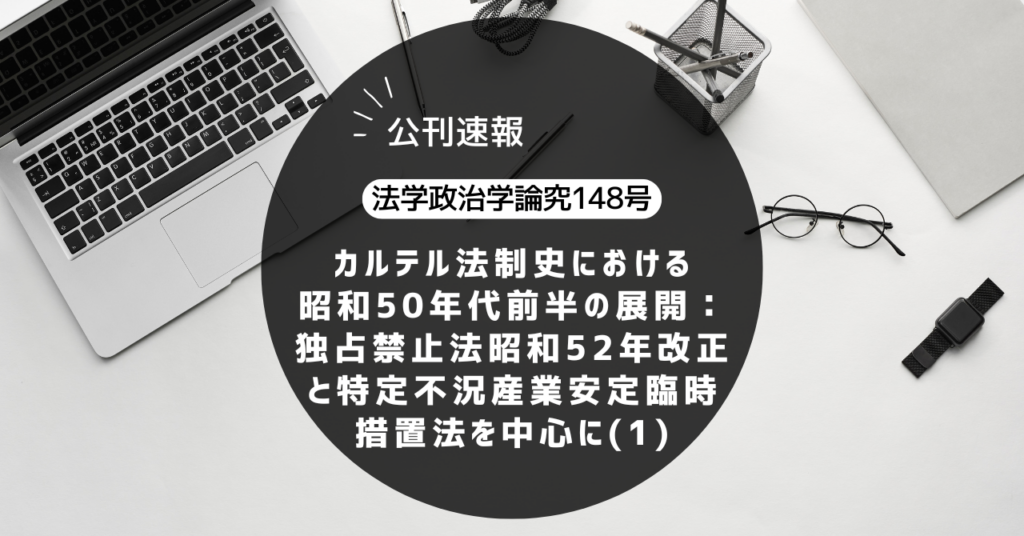 法学政治学論究148号(2026)1-49頁に、「カルテル法制史における昭和50年代前半の展開:独占禁止法昭和52年改正と特定不況産業安定臨時措置法を中心に(1)」が掲載されました。